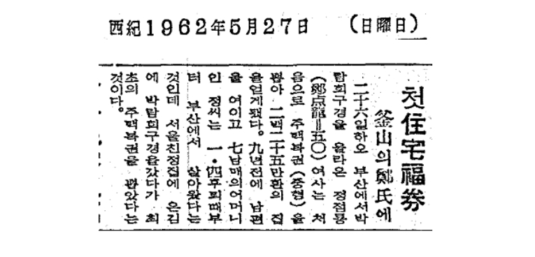 주택복권이 1969년 9월 15일 처음 발행되었는데 최초당첨자는 1962년 부산에서 박람회 구경을 올라온 정점룡 여사로 기록되어있다. 이때의 당첨금이 225만환의 집을 얻게 되었다고 소개하고 있다.
