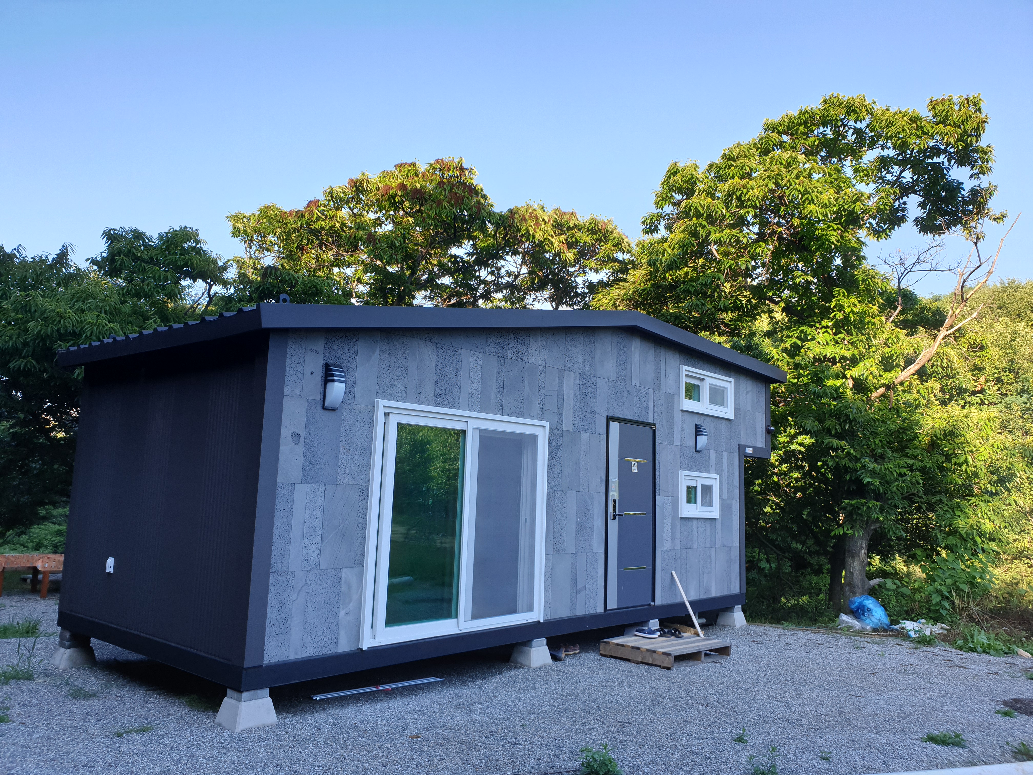 농막 가격은 처음 봤던 것에 비해 1자 주방을 ㄱ자 주방으로, 메탈을 현무암으로 하고 내부 마감 미송도 편백나무 루바로 바꾸고 블라인드 설치 등 추가한 데다 배송비와 크레인 비용이 추가되어 약 2300여 만원이 들었다.