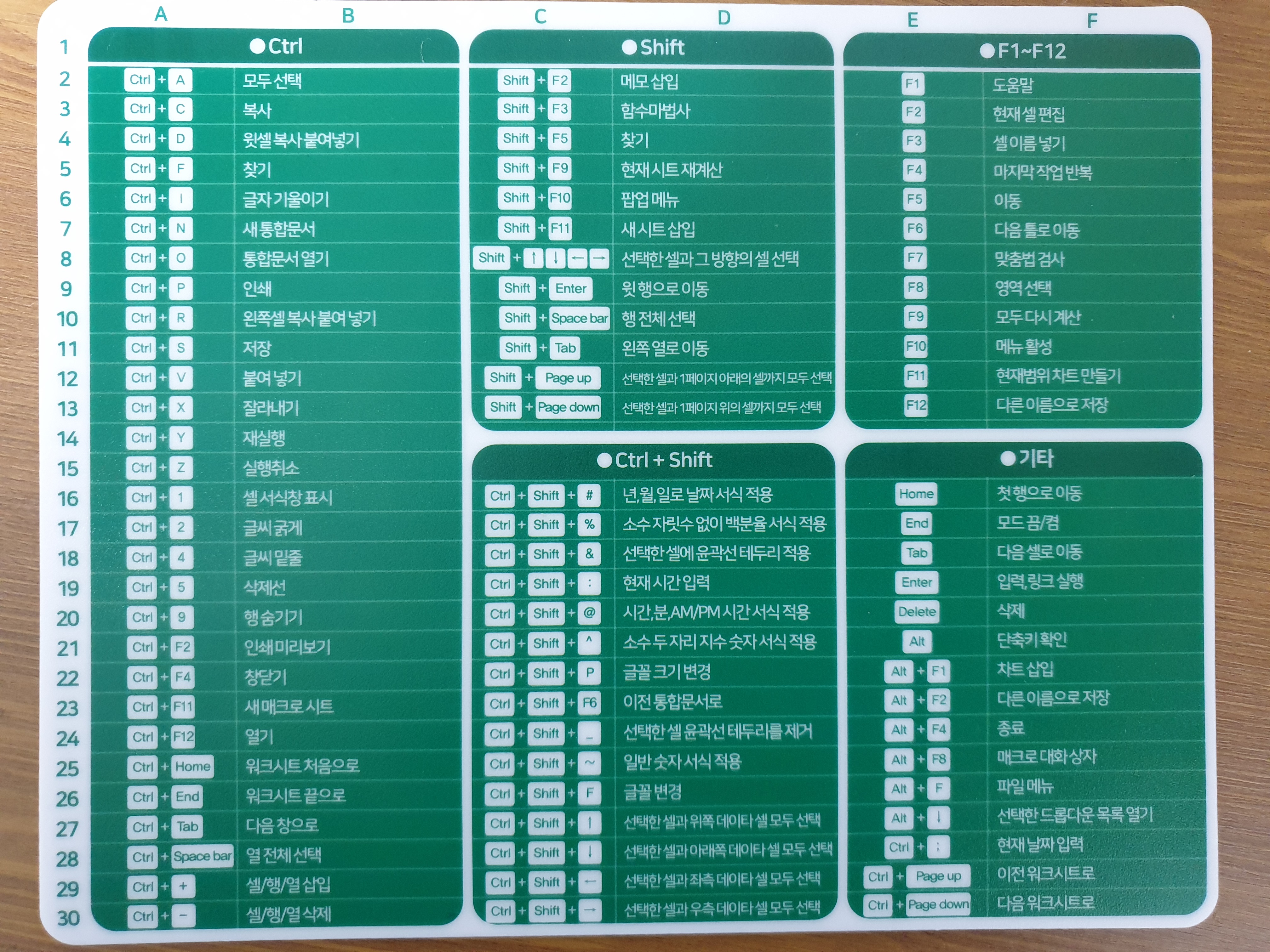며칠 전 우연히 다이소에 들렀다 컴퓨터 마우스 패드를 사려고 기웃거리다 엑셀 단축키 모음이 있는 패드를 발견하고 주저없이 샀다. 엑셀을 공부할 때 아쉬웠고 아직도 잘 외워지지 않는 수식을 눈앞에 두고 공부해보려고 한다.