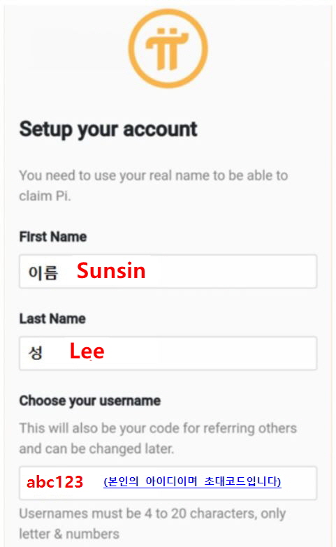 6. usename에 원하는 아이디 입력(향후 추천 받으실 때 사용됨.< 예,love88>.)
