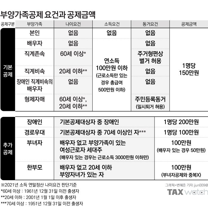 [1] 세무가이드 - 부양가족 인적 공제 판단 기준 확인하세요! (1인당 기본 150만 원 ... (http://guide.taxmedicenter.com/29/?bmode=view&idx=6439965)