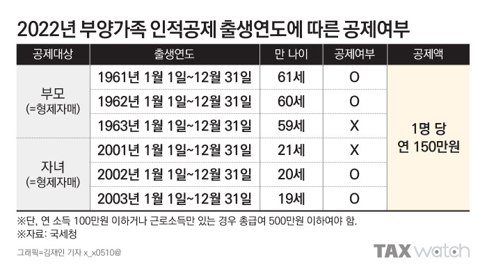- 나이 요건 : 부양가족의 나이가 일정 기준을 충족해야 합니다. 예를 들어, 부모님이 1961년부터 1963년 사이에 태어난 경우 공제를 받을 수 있습니다.
