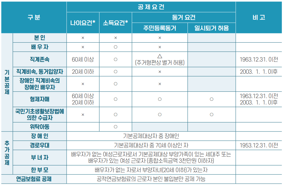 - 거주 요건 : 부양가족이 함께 거주해야 하며, 이 요건은 일부 예외가 있을 수 있습니다.