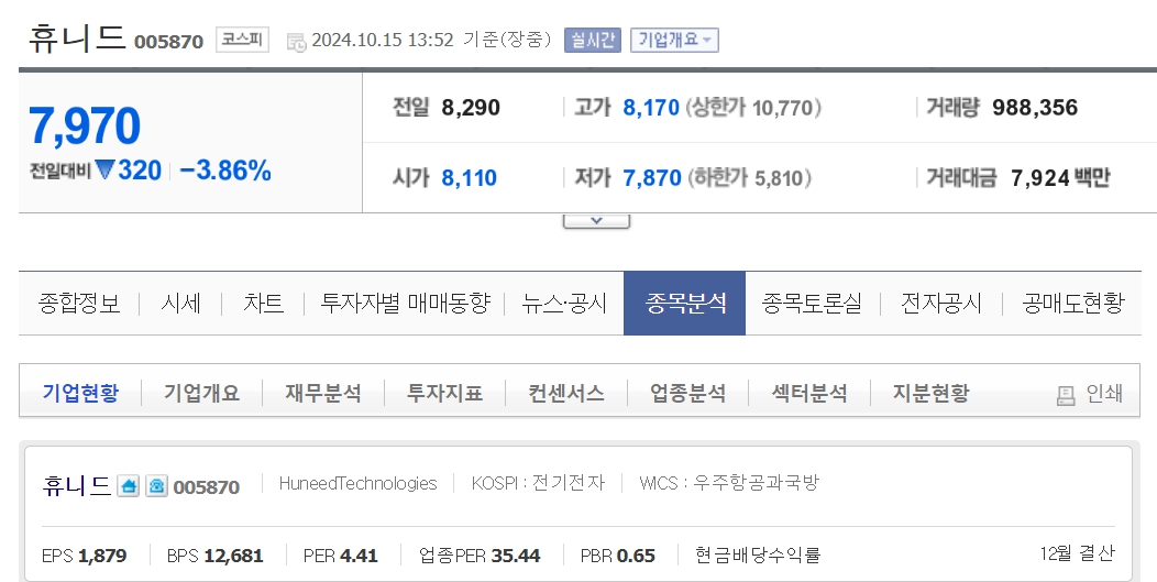 휴니드는 액면가 5000원으로 시작했으며, 현재 주가는 2024년 10,15 기준 7,970원입니다.