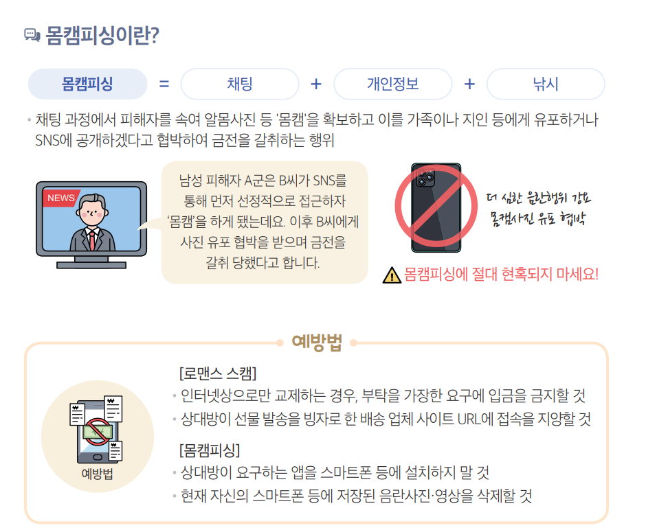 [1] 전북특별자치도교육청 - 디지털성범죄'몸캠피싱'예방 안내 (https://www.jbe.go.kr/board/download.jbe?boardId=BBS_0000002&menuCd=DOM_000002710001000000&paging=ok&startPage=4&searchOperation=AND&dataSid=470593&fileSid=434320)