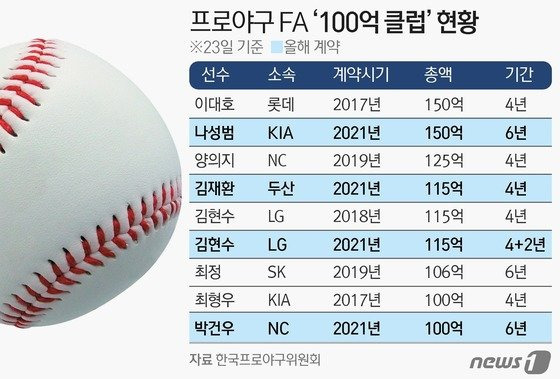 이 이미지는 한국 프로야구 FA에서 "100억 클럽"에 속하는 선수들의 계약 내용을 보여줍니다. 이 통계는 FA 시장에서 자주 거론되는 선수들의 성적과 계약에 따른 재정적 측면을 잘 드러내고 있습니다.