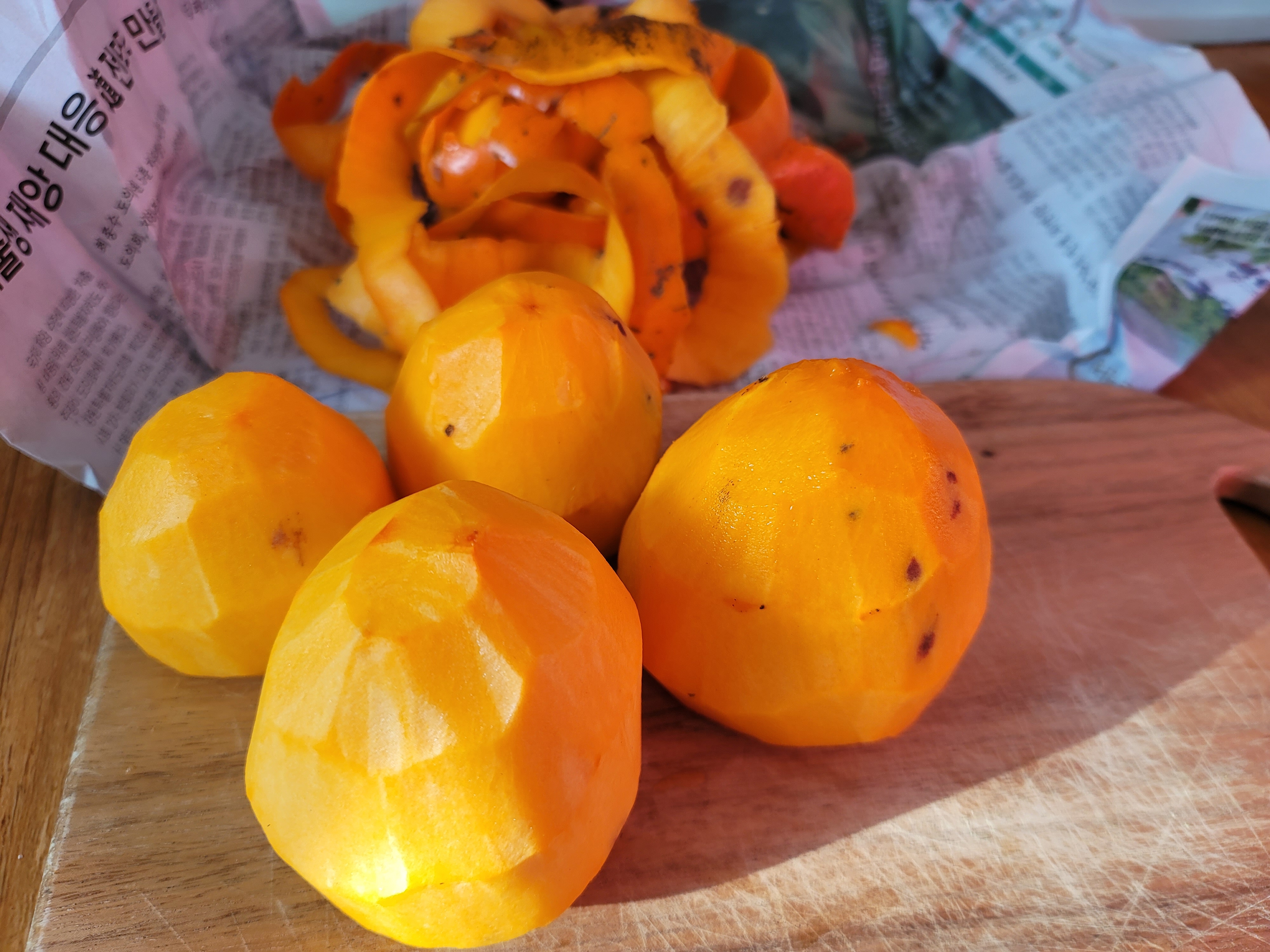 농막에 따놓았던 감으로 처음에는 홍시로 만들 요량이었는데 자주 오지 못해 차라리 이것도 감말랭이를 만들자는 아내 성화에 집으로 가져가 감말랭이를 만들기로 했습니다.