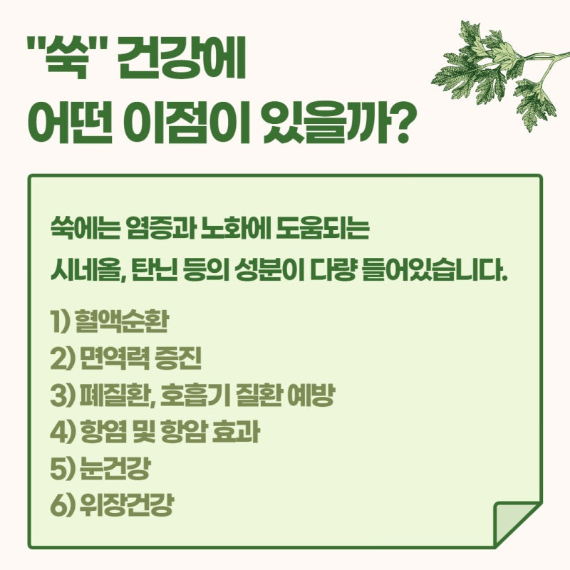 쑥은 다양한 건강 효능으로 유명합니다. 비타민 B1, B6, 철분, 칼슘 등이 풍부해, 몸속 탄수화물과 에너지 대사를 촉진하고 해독 기능을 강화하는 데 도움을 줍니다. 특히 여성의 자궁 건강에 좋으며, 혈액순환을 개선하고 면역력을 높이는 데 효과적입니다. 쑥은 또한 소화 문제를 해결하는 데 도움이 되며, 감기와 같은 호흡기 질환 예방에도 기여합니다.