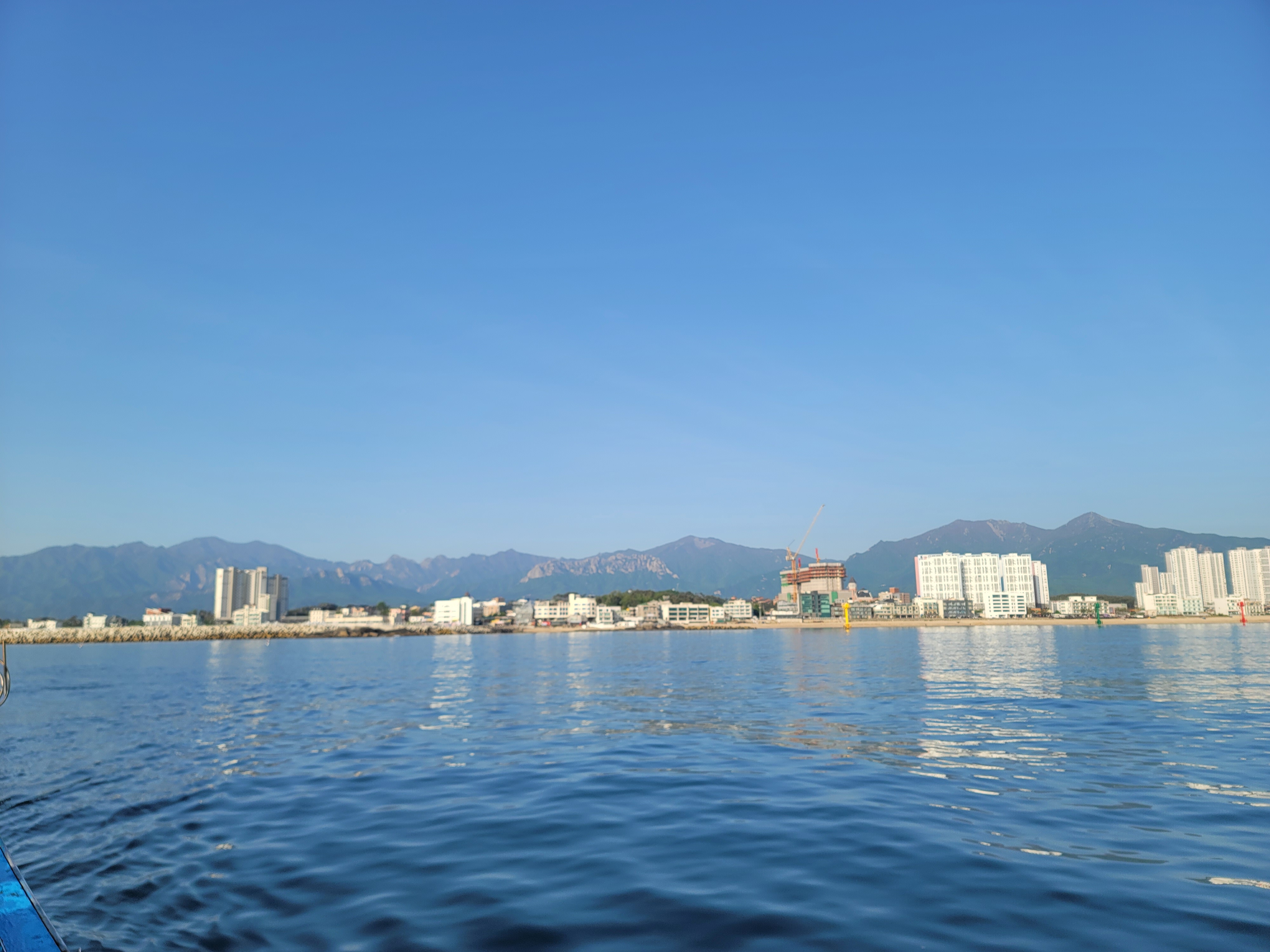 멀리 울산바위와 설악산이 보이고 봉포항 풍경이 한눈에 들어옵니다.오늘은 하늘과 바다색이 동색이네요.예전에 조그만 어촌마을이었는데 요즘은 속초가 가깝다는 이유로 아파트와 생활형 숙박시설이 많이 들어와 예전 모습을 찾기 어렵습니다.