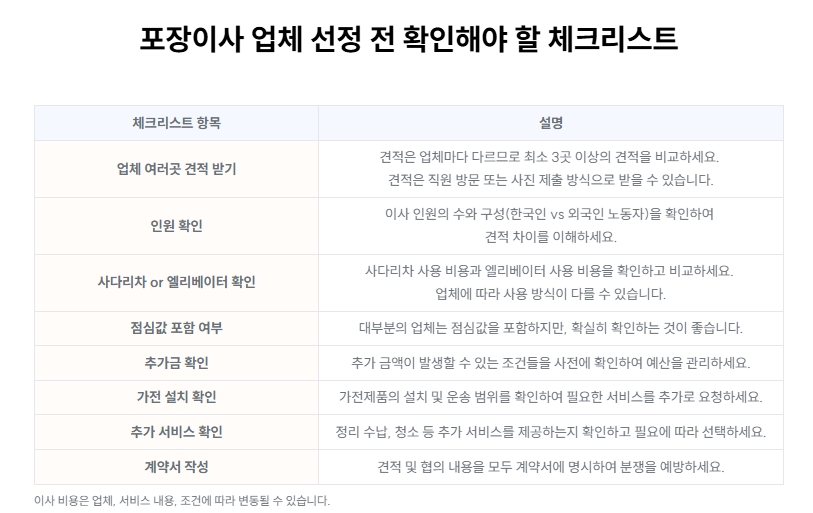이사를 준비하면서 포장이사 업체 선정은 매우 중요한 과정입니다. 신뢰할 수 있는 업체를 선택하고, 계약서 작성 시 주의사항을 잘 지킨다면 이사 과정이 훨씬 수월해질 것입니다.