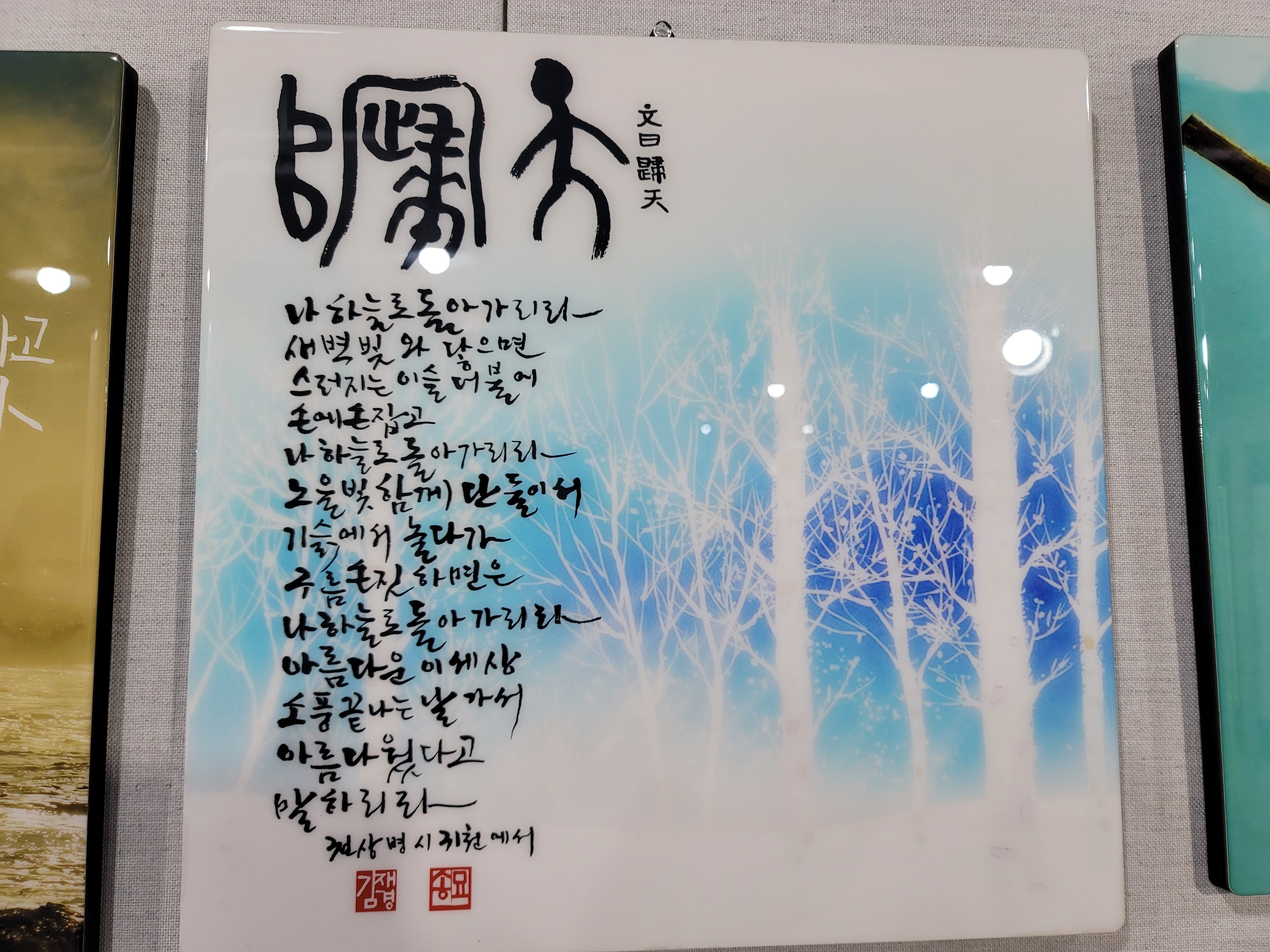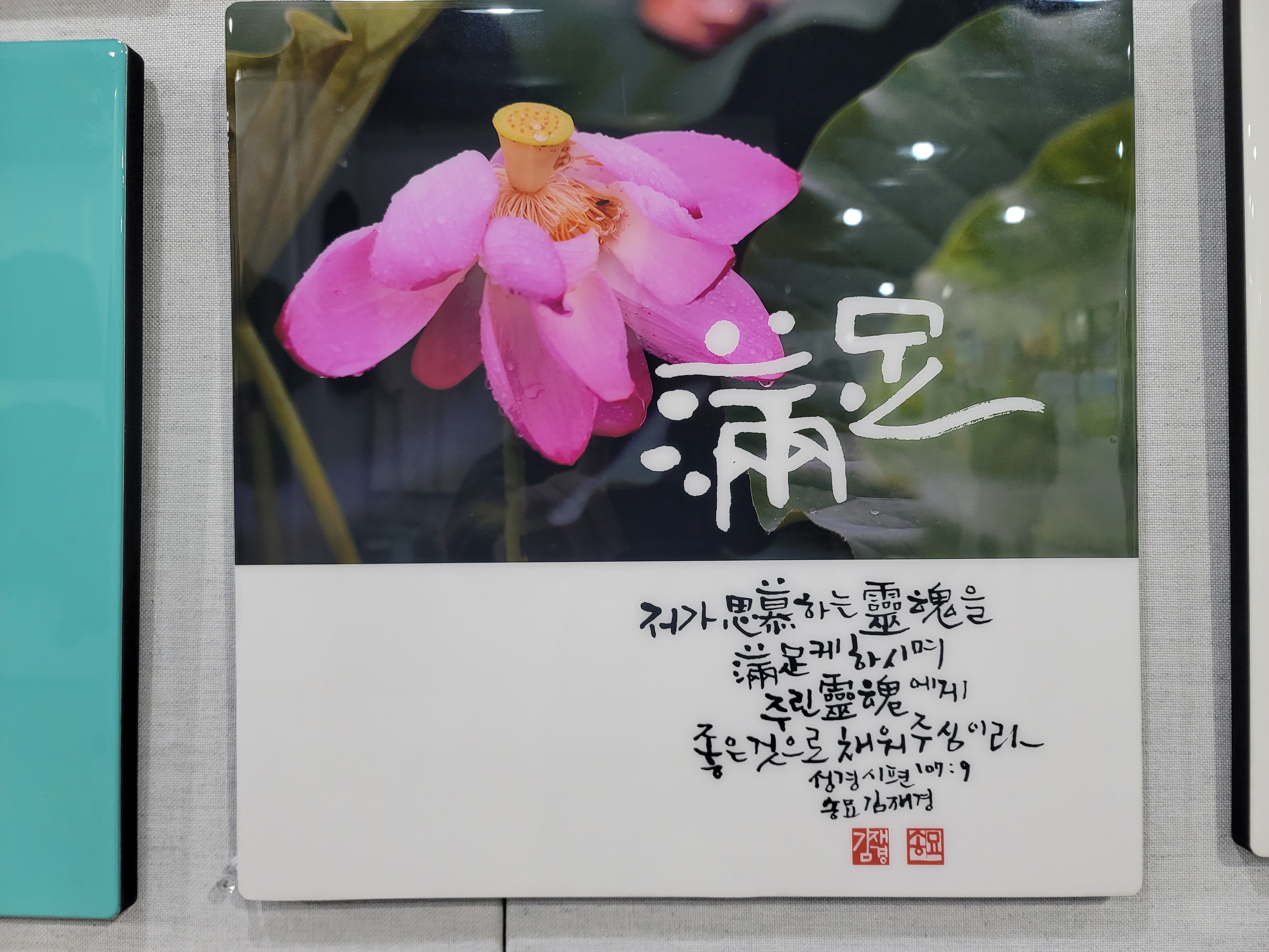 이번 캘리그라피 수강생 중 지인이 작품을 출품했다고 해 아내와 함께 서둘러 아침을 먹고 문화예술회관으로 향했습니다.이른 시간임에도 불구하고 주차할 곳이 없을 정도로 차들이 많이 와있어 놀랐습니다. 안으로 들어서니, 서예, 사진, 꽃, 의상, 캘리그라피,유화 등 수많은 작품들이 전시되어 있었고 작품을 감상하는 사람들도 많았습니다.