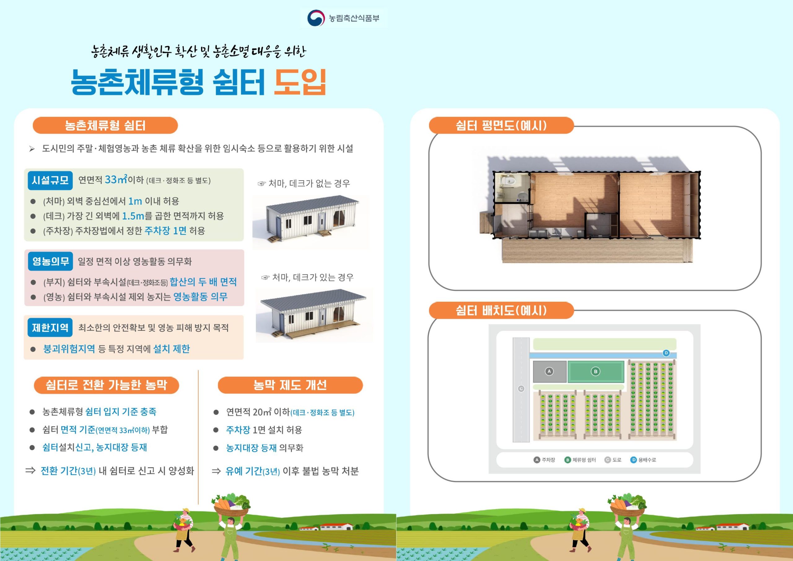 [4] Naver - 12월부터 숙박가능한 농촌체류형 쉼터 도입, ... (https://files-scs.pstatic.net/2024/10/12/lY1pGqXOM9/%EB%86%8D%EC%B4%8C%EC%B2%B4%EB%A5%98%ED%98%95%20%EC%89%BC%ED%84%B0.pdf)